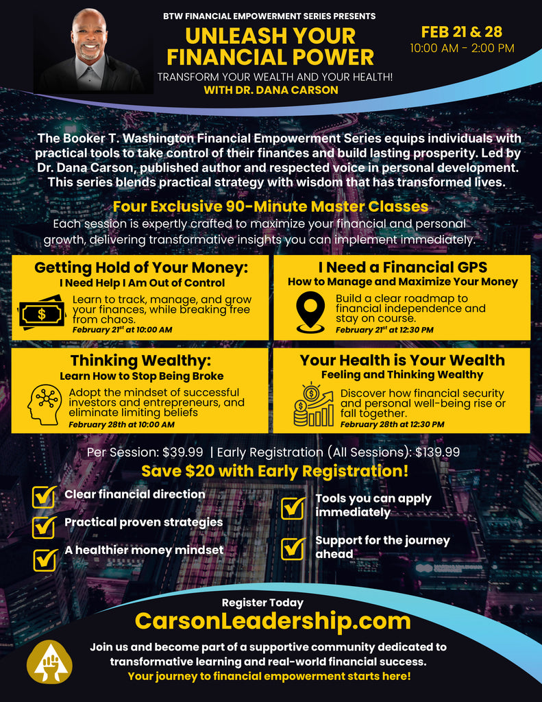 The Booker T. Washington Financial Empowerment Series is designed for individuals seeking lasting financial prosperity and personal well-being. Our mission is to deliver practical tools, proven strategies, and actionable insights that empower you to take control of your finances and your future. Join a supportive community dedicated to transformative learning and real-world results.